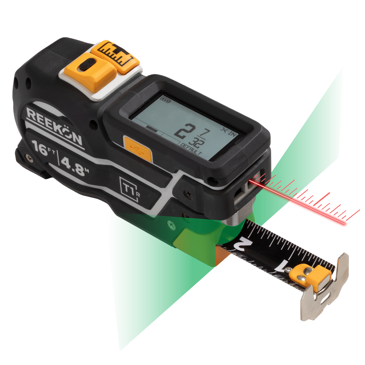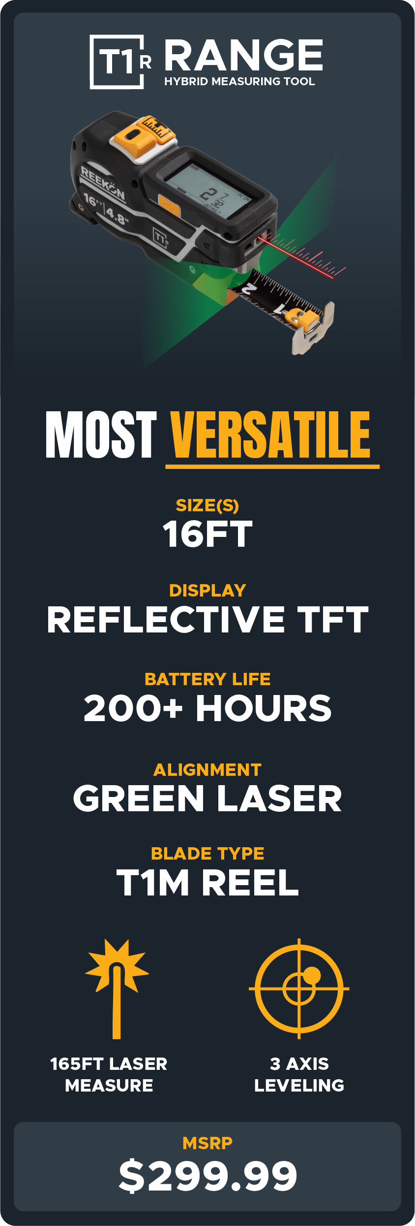 The T1R Range Hybrid measuring Tool combines a Digital Tape Measure, Level, and Laser Distance Measure (LDM) into a single professional measuring tool.