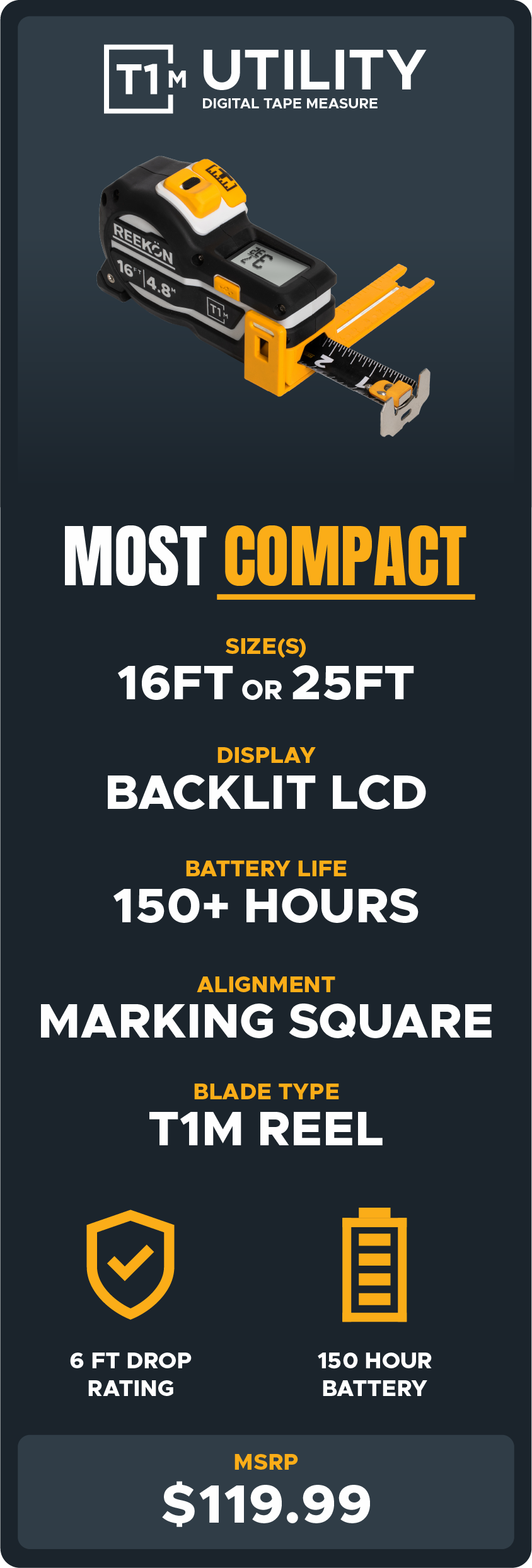 The T1M Utility is a Complete Upgrade Over a Standard Tape Measure. With many advanced digital features, the T1M greatly reduces errors and speeds up the job site.