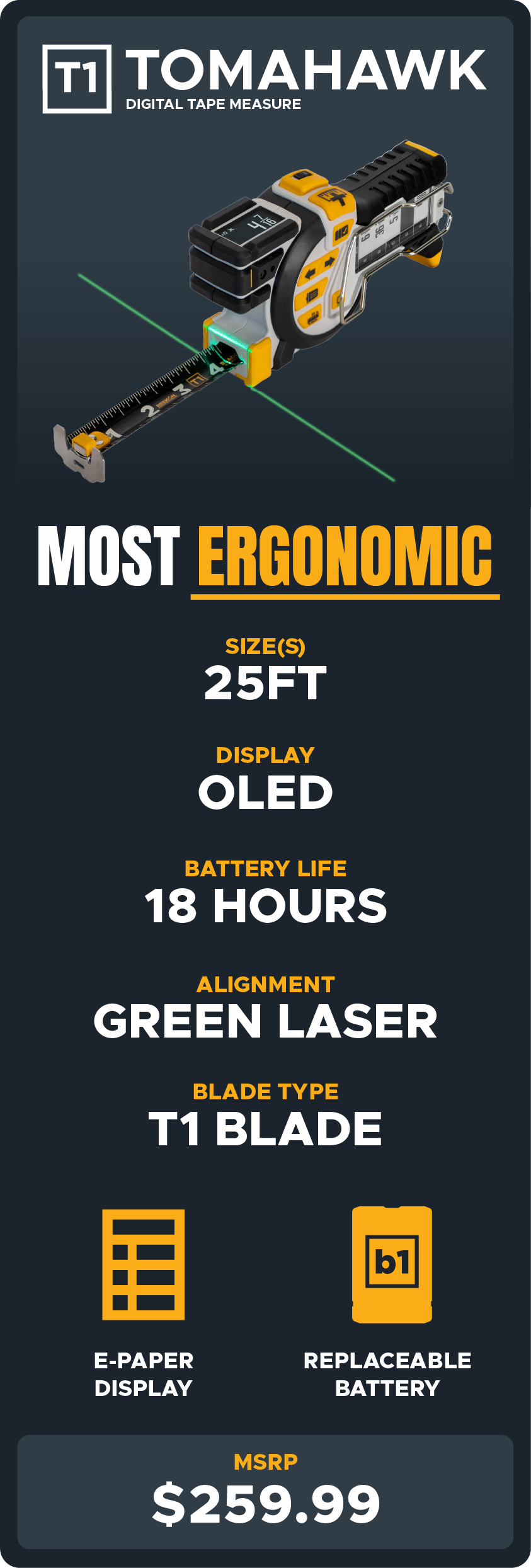 T1 Tomahawk 25FT Digital Tape Measure Overview